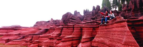 進山的路邊有幾小孩子在賣山里采的菌子,以為菌子很好采,我們也到山里仔細的找了找,結果連菌子的影子都沒看到. 更為神奇的是構成紅石林景觀的石頭都會隨天氣,溫度的變化而變換色彩。當地老人說,夏季烈日當空時,漫山遍野都是火紅的,紅艷艷的一片,十分壯觀;陰天,石頭都是褐紅帶紫,到了大雨天,石頭又成了黑黢黢的一片。