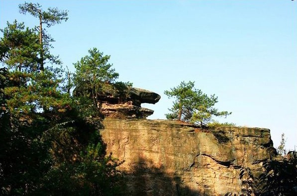 【摘星臺(tái)】 黃石寨頂東頭,伸出一道約100米的山梁, 山梁盡頭有由兩塊砂巖相疊構(gòu)成的一座觀景臺(tái)。基座巖石面積約20平方米, 高5米左右;疊其上的巖石主10米,頂部為直徑約5米的平臺(tái),周圍鐵欄圍護(hù),一古松似傘,挺立其上。下臨幽谷,上頂云天。置身臺(tái)上,頭上白云飄拂,腳下幽谷翠峰。雨天云霧彌漫,周邊峰頂無窮變幻。皓月當(dāng)空時(shí),立于平臺(tái)上,滿天星斗似伸手可摘。1993年11 月28日,國務(wù)委員張勁夫登臺(tái)觀景,為之命名。黃石寨東沿有一向外突出半截懸空的圓弧形觀景臺(tái),因所處位置極高,臨百丈深淵,故名摘星臺(tái)。臺(tái)上可容10余人。置身高臺(tái),環(huán)繞四周, 但見風(fēng)云滾動(dòng),林泉奔突,奇峰異石,赴入眼底,遠(yuǎn)水近景一覽無遺,大有"會(huì)當(dāng)凌絕頂,一覽眾山小" 之勝。