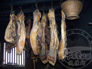 (4)用松柏枝加核桃殼、花生殼、桔子皮等柴草料進行煙熏烘烤,月余后待肉變棕紅時即可。