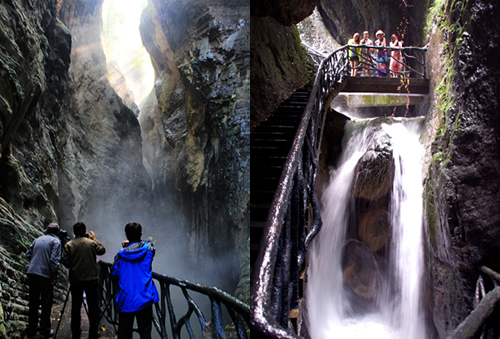 西線,為雪花溪,現改名為仙女峽谷,峽谷長800米,最窄處僅1米左右,上下落差近200米,因水的長期回旋沖刷, 巖層的堅硬度各異,形成了底寬頂窄,時北,時西,時東,陰暗無光,形似溶洞, 山上泉水飛流直下,形成梯級瀑布,擊打在巖壁上濺起的水花猶如雪花飛舞,潭中一片雪白,古人稱之為雪花洞,峽谷中有七個大小各異的潭池在沖擊的水花中若隱若現,故改稱為七仙女人間沐浴瑤池,從開天辟地起無人行通過,現在已修好的占道,行走于峽谷水花之中,有入仙境之感。