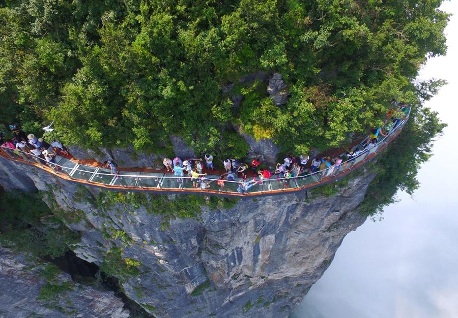 玻璃棧道是張家界天門山景區(qū)繼懸于峭壁之上的鬼谷棧道、憑空伸出的玻璃眺望臺、橫跨峽谷的木質(zhì)吊橋后打造的又一試膽新景點。這條看著就讓人腿軟的玻璃橋給人帶來的刺激震撼感可與舉世聞名的美國大峽谷玻璃走廊“天空之路”媲美。